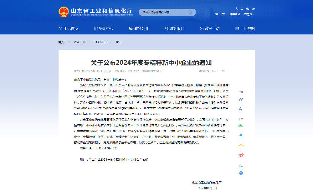 近日,山東省工業和信息化廳公布了2024年度專精特新中小企業名單,山東中科瑞沃環境技術有限公司成功入選。